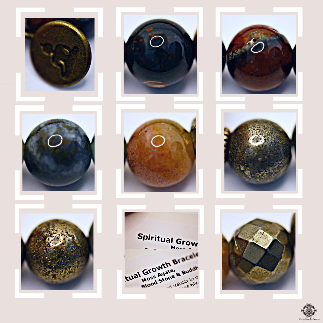 Combining Moss Agate, Pyrite, Bloodstone, and a Buddha symbol in a bracelet creates a harmonious blend of energies that promote grounding, prosperity, vitality, and spiritual enlightenment.
