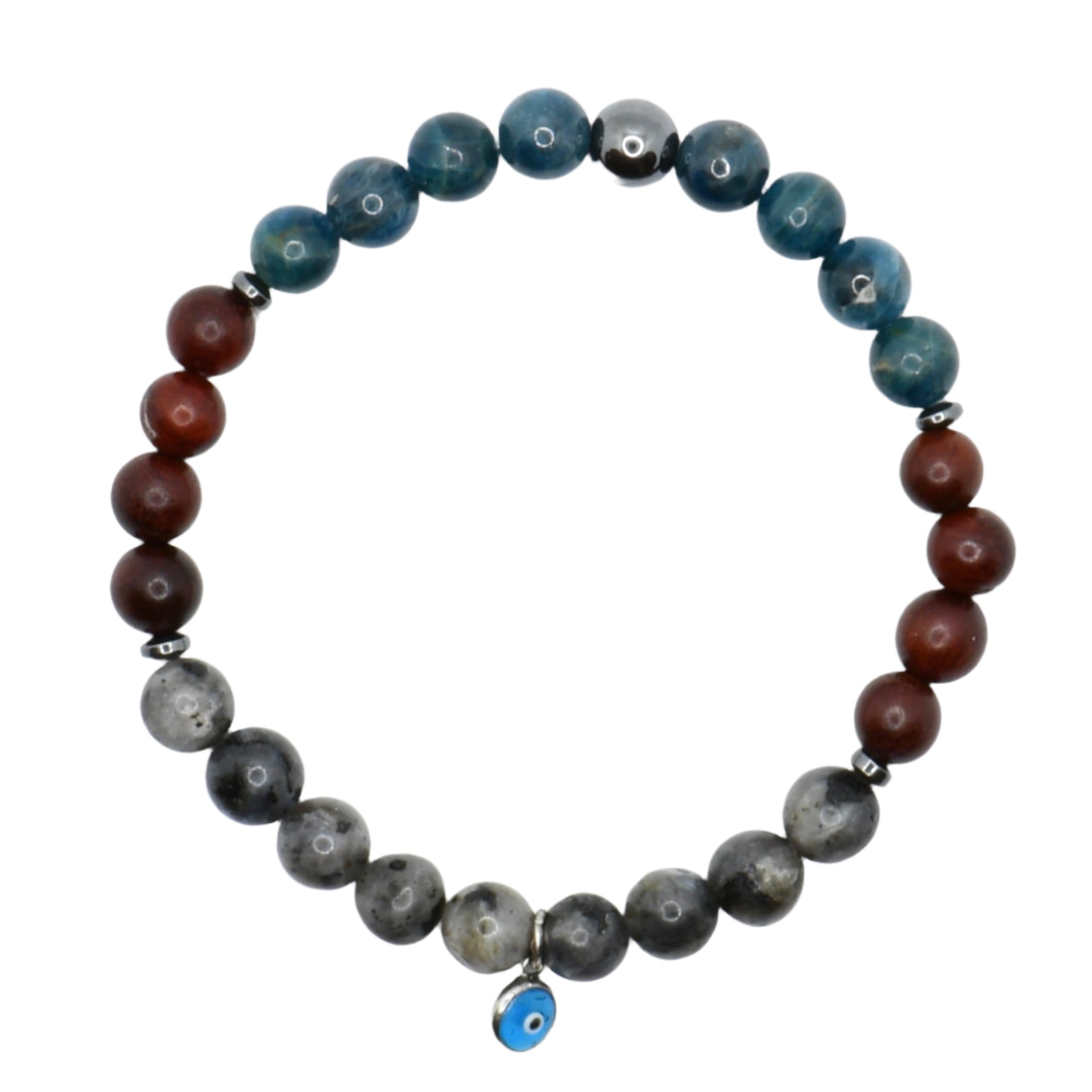 Combining Apatite, Hematite, Labradorite, Sandalwood, and the Evil Eye symbol in a bracelet creates a powerful blend of energies that promote communication, grounding, spiritual insight, protection, and positive energy.