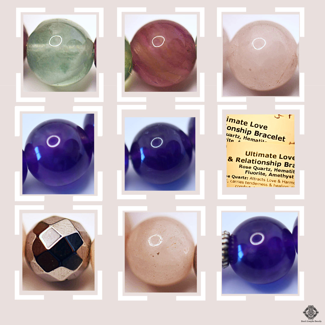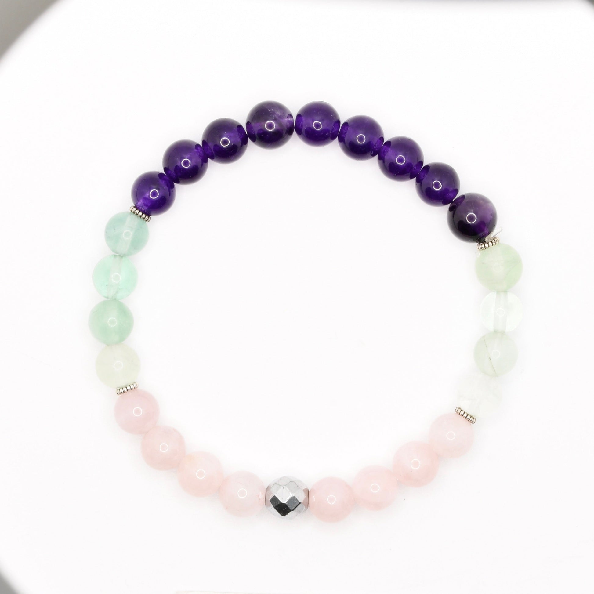 Combining Rose Quartz, Hematite, Fluorite, and Amethyst in a bracelet creates a harmonious blend of energies that promote love, healing, protection, and spiritual growth.