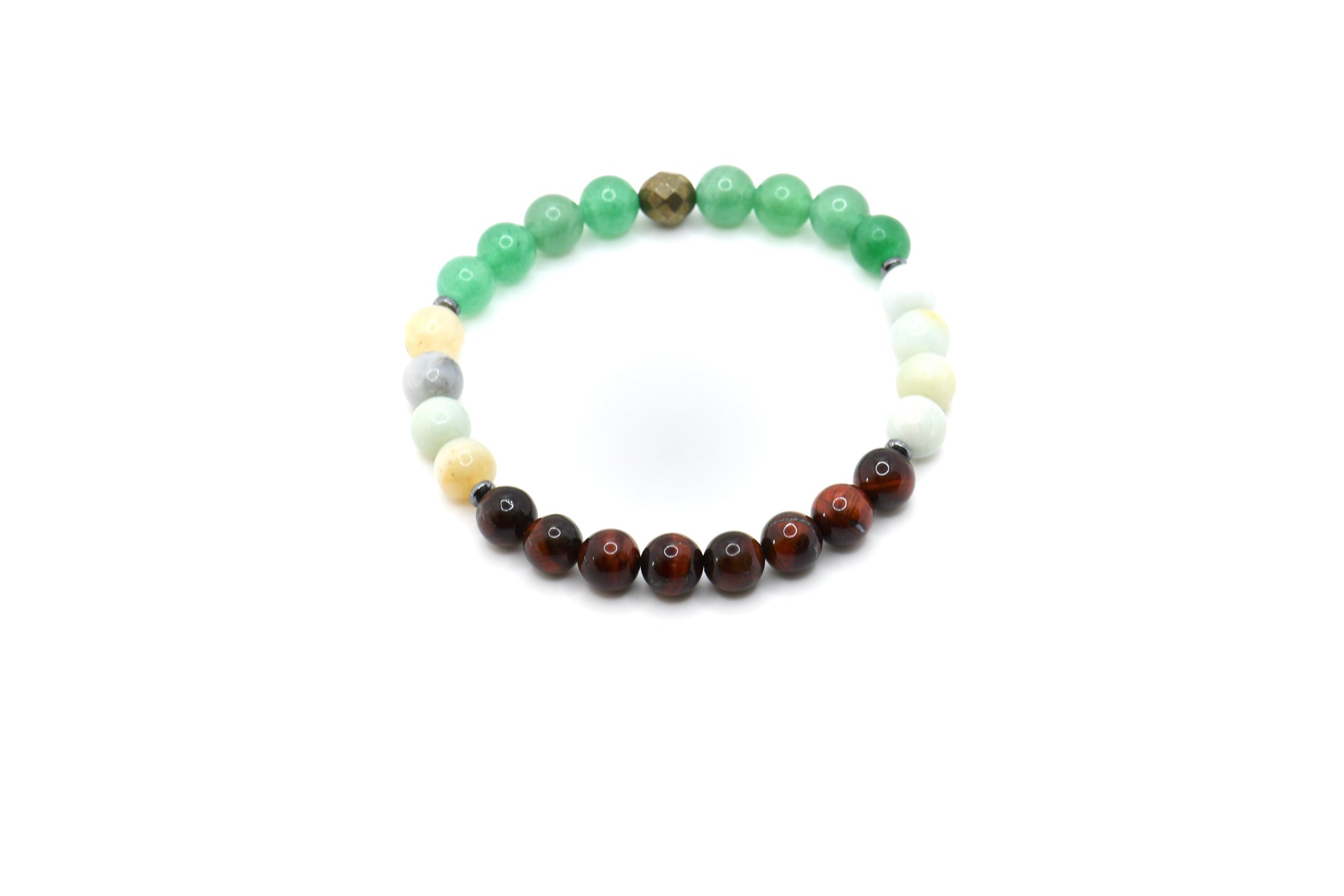 Combining Green Aventurine, Pyrite, Hematite, Amazonite, and Red Tiger Eye in a bracelet creates a powerful synergy of energies, promoting prosperity, grounding, emotional healing, and personal strength.