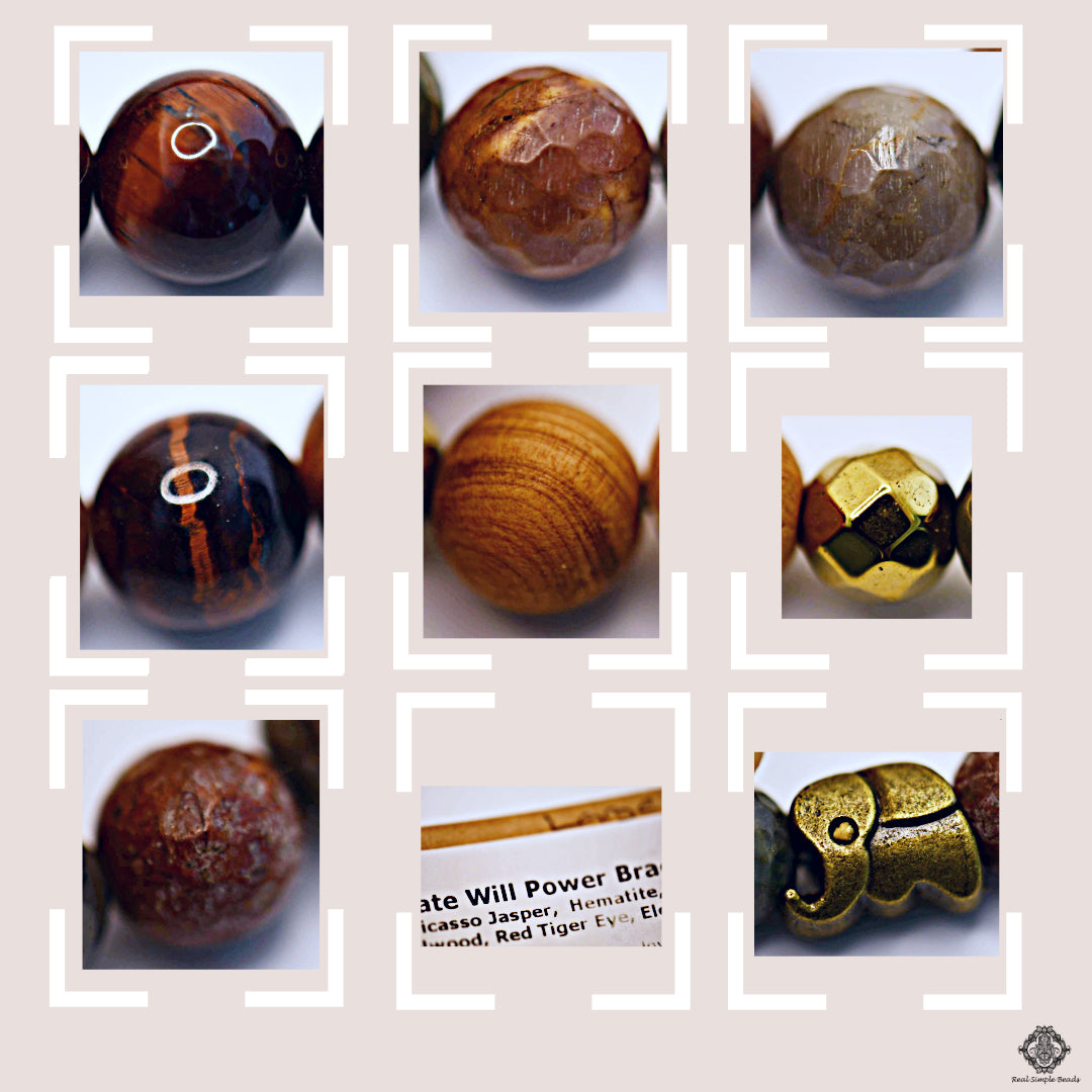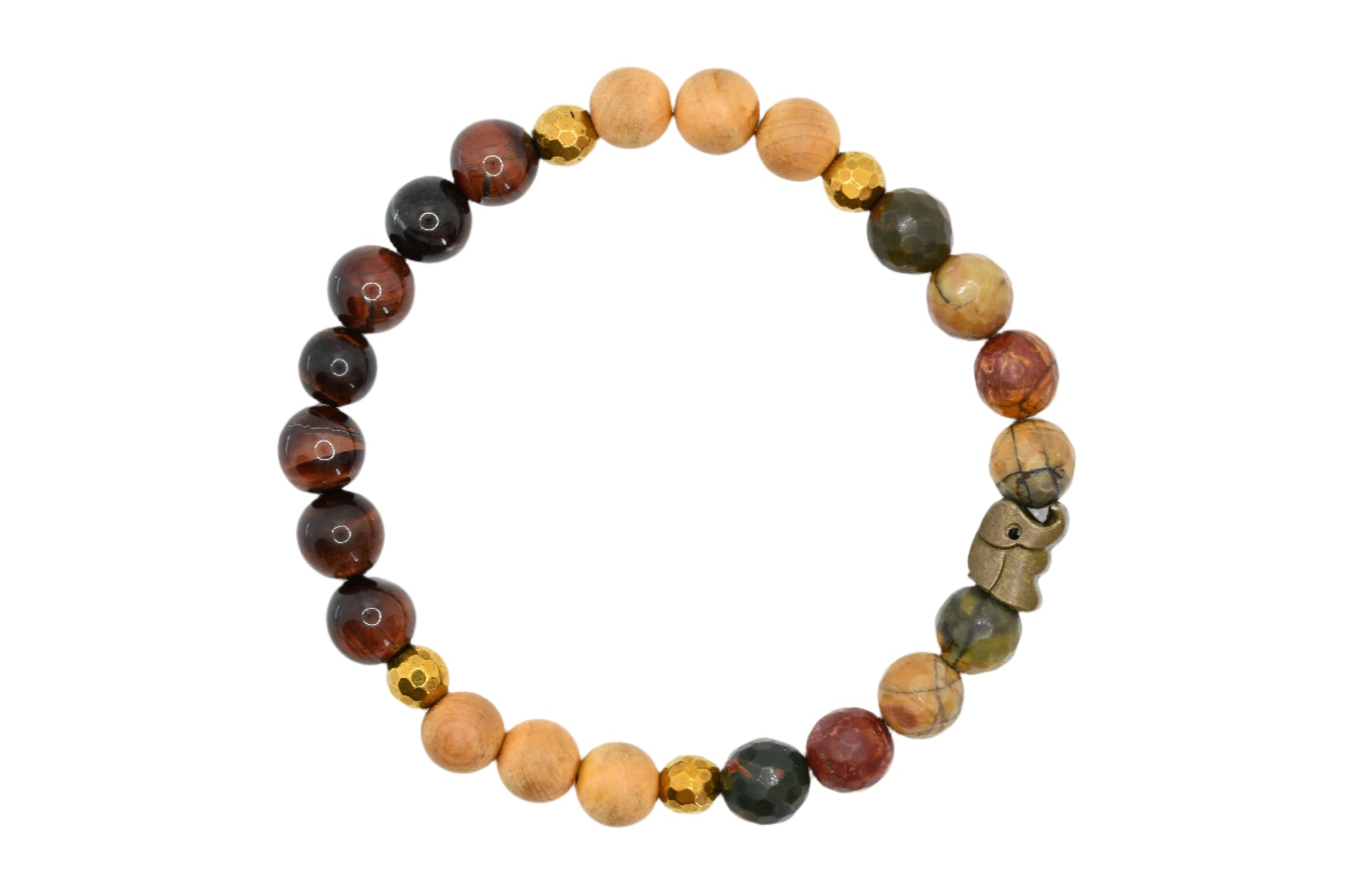 Combining Green Variscite, Hematite, Sandalwood, Red Tiger Eye, and the Elephant symbol in a bracelet creates a harmonious blend of energies that promote emotional healing, grounding, protection, and wisdom.